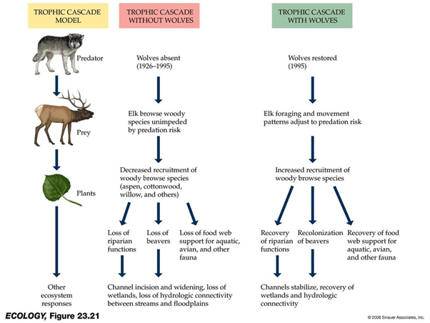 Grey wolves (Canis lupis) were completely removed from Yellowstone National Park, northwest USA during the mid-1920s, until being re-introduced in 1995-1996 (Ripple & Beschta, 2012). In the 70 years without wolves, populations of elk and bison thrived, whilst vegetation was far less common due to unregulated grazing. The simplest food web to visualise this would have wolves at the top, bison and elk below, then vegetation such as aspen, willows and cottonwoods at the bottom (Ripple & Beschta, 2012):
